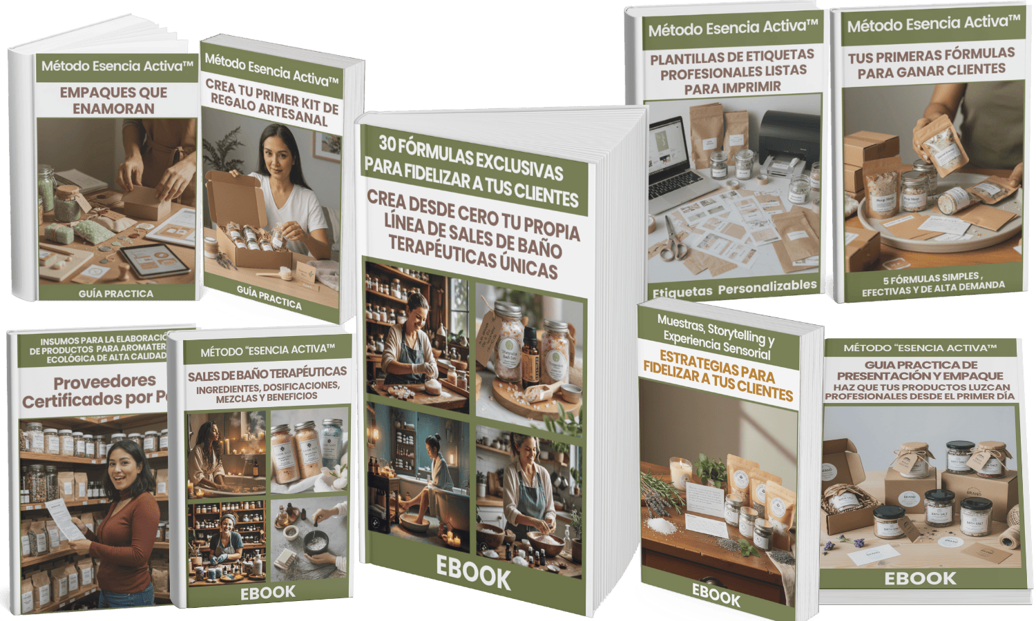 Imagina tener Tu Propia Línea de Sales de Baño Terapéuticas, sin Cometer Errores ni Perder Material. Eso es exactamente lo que te llevarás con el Curso completo Paso a Paso. Aumenta tus Ventas con el Método “Esencia Activa™».